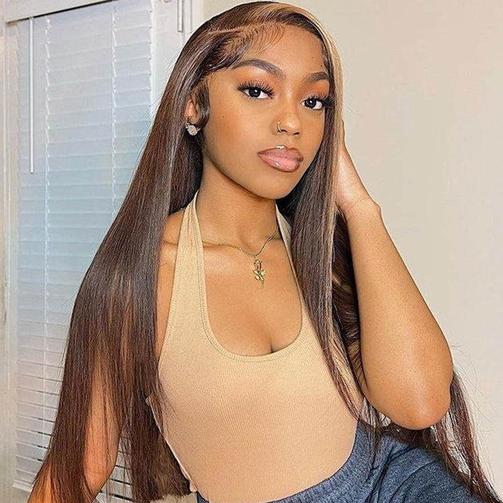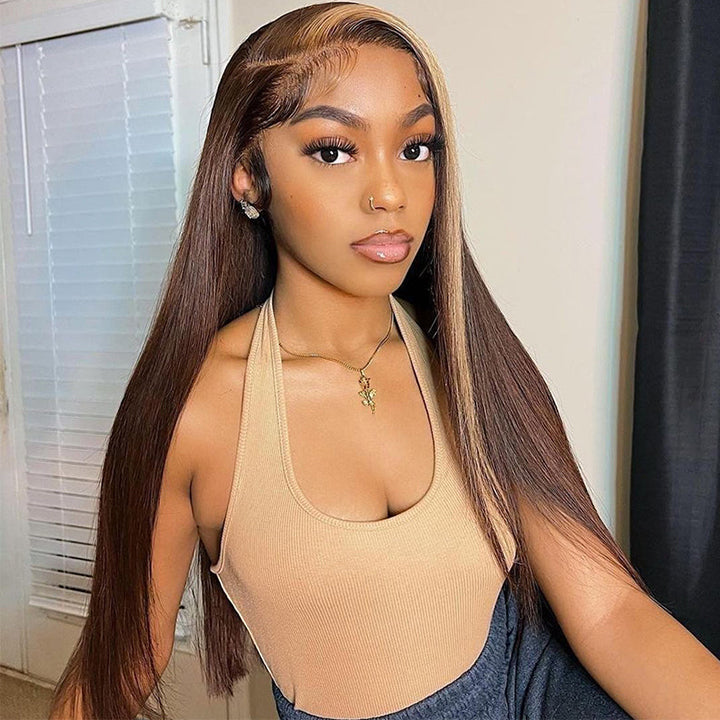 Honey Blonde & Brown Skunk Stripe Highlight Wigs Straight Lace Front Wig Pre Cut Lace