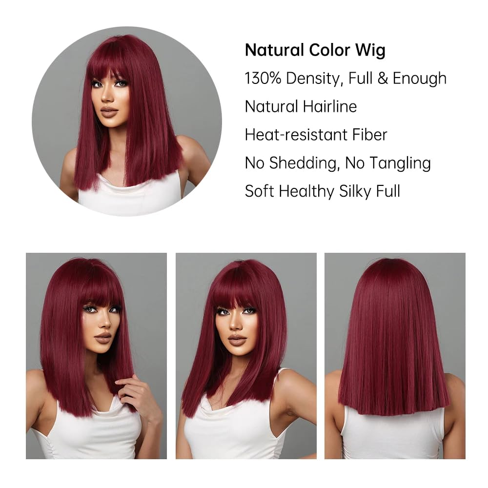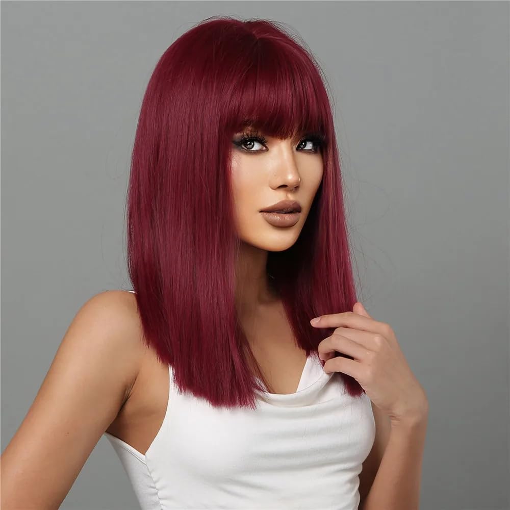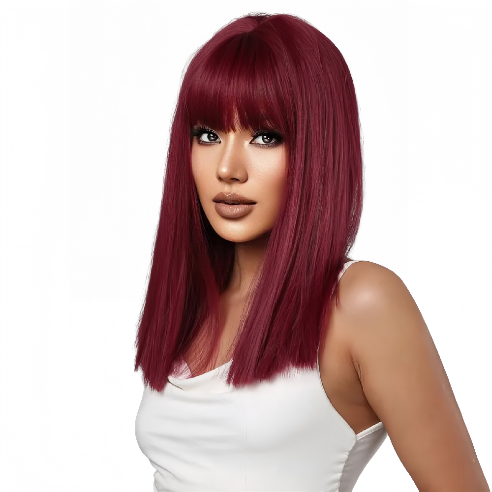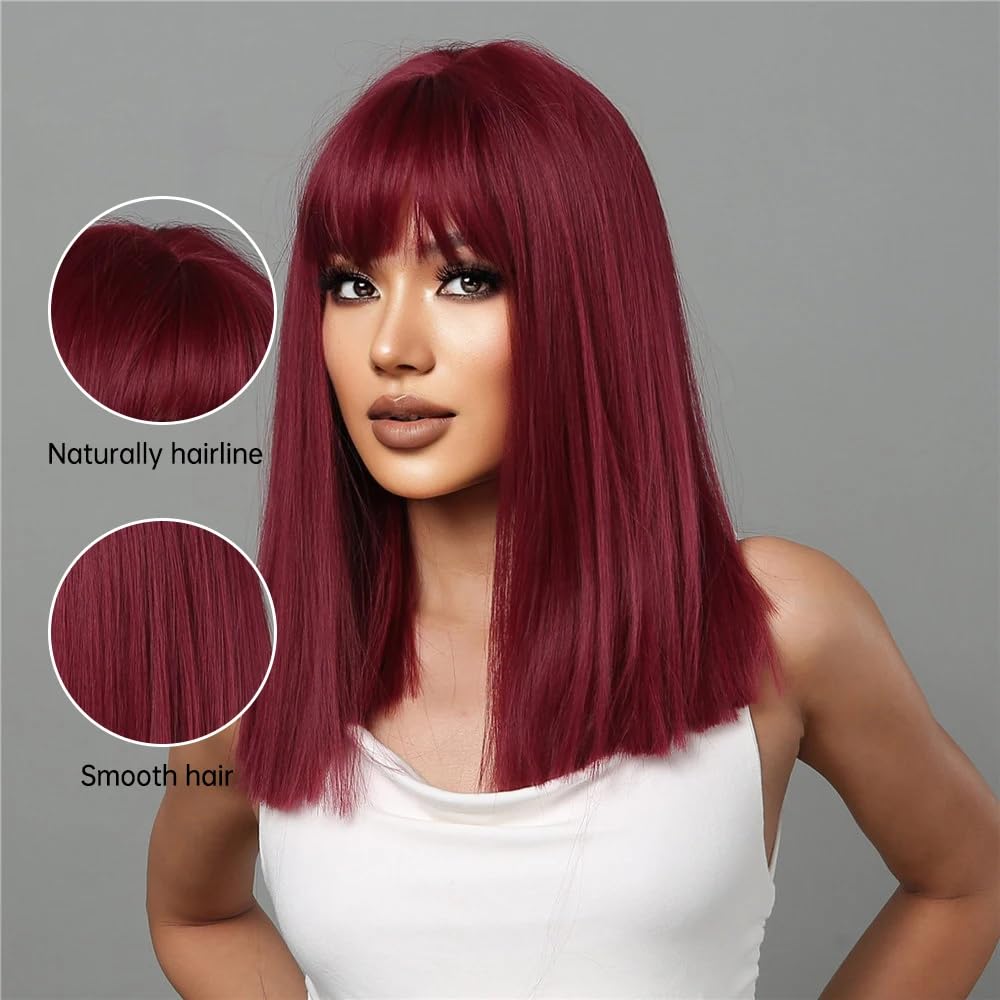 【Fashion Burgundy Wigs】The red wig with full bangs,the bangs and distinctive waves bring a modern flair to the classic silky style