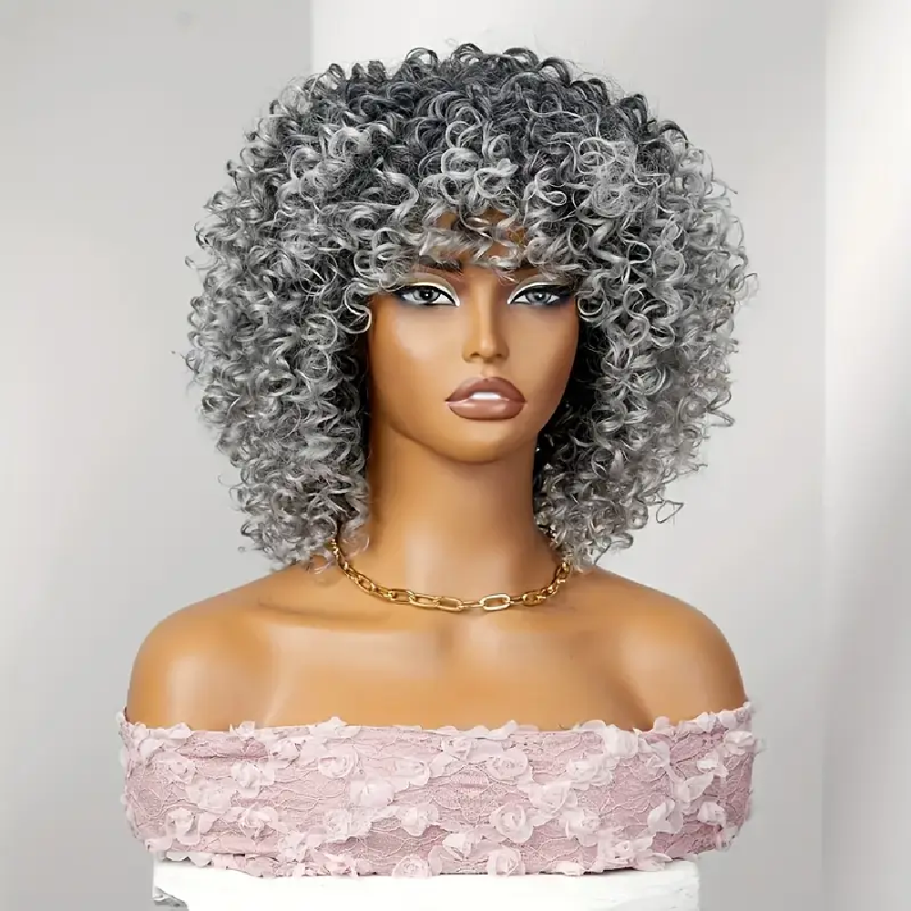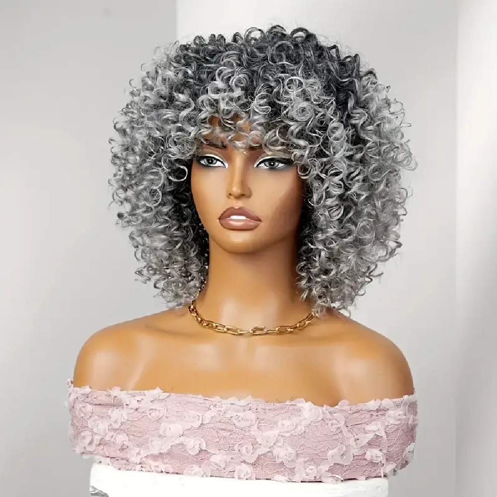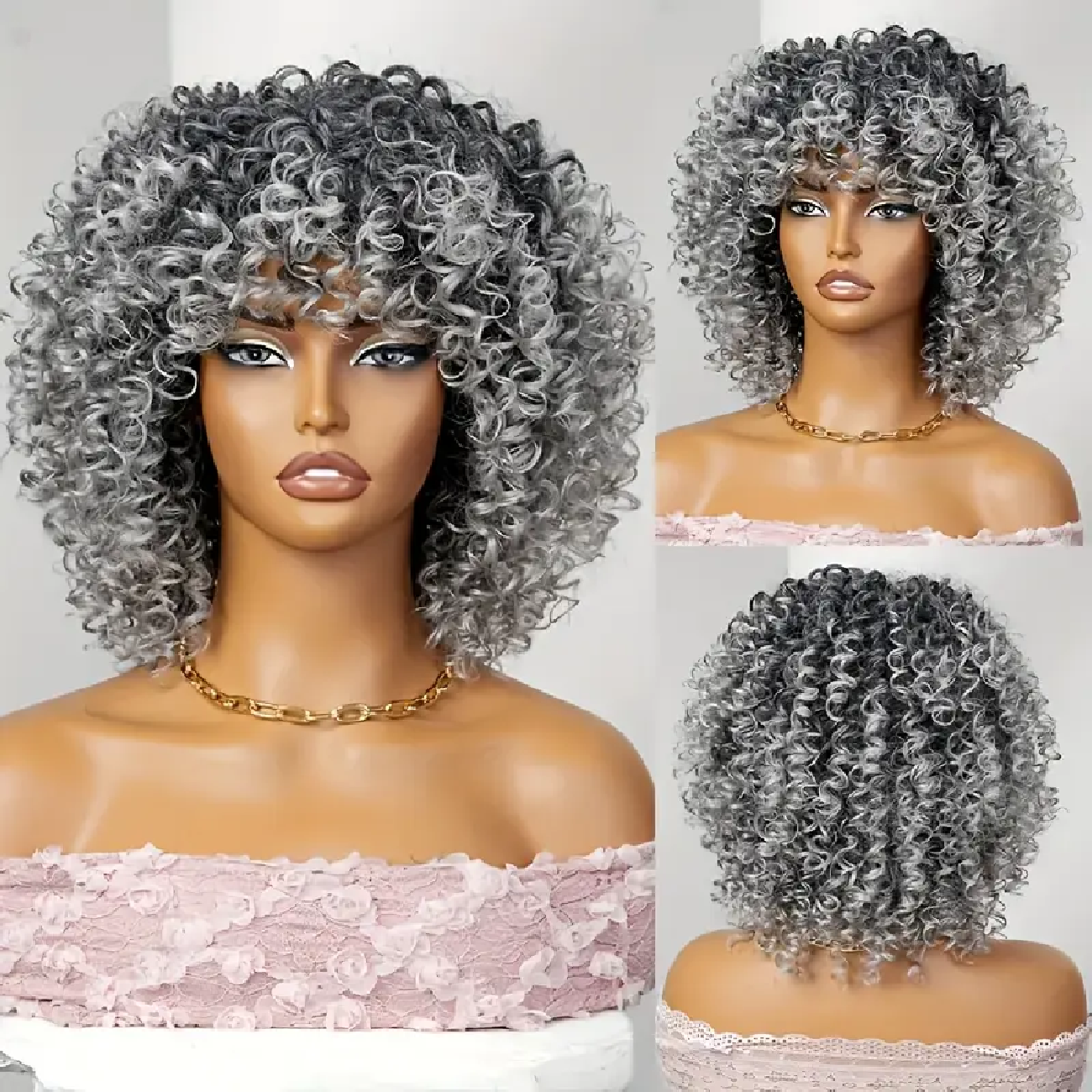 【Afro Kinky Curly Wigs With Bangs For Synthetic Wigs Silver Gray Wig style】: 150% density natural  wave wig touch more soft and fluffy Feel like human hair and scalp