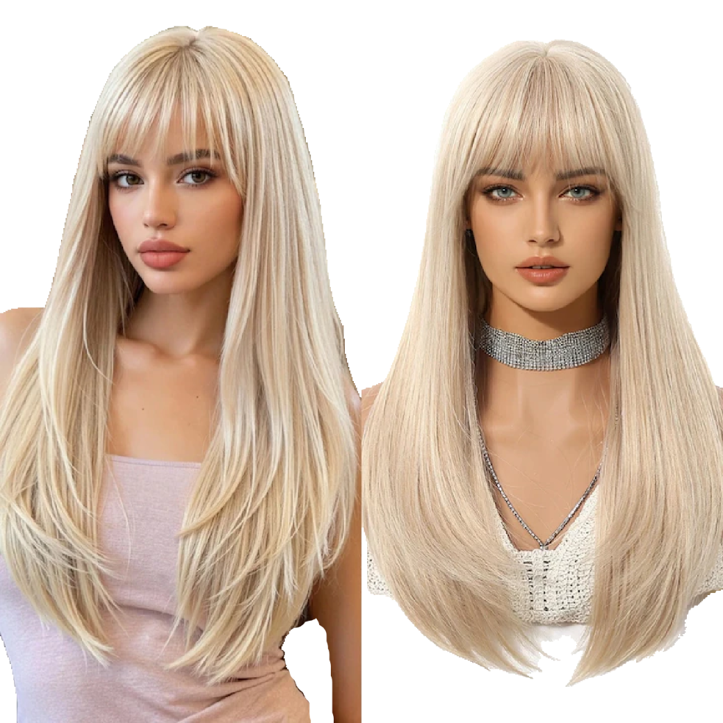 【Upgrade synthetic curly lace wig materia】: This Long Layered Blonde Synthetic Wig with Bangs wig is made of high quality heat resistant imported soft synthetic fiber; The temperature can be up to 180 ℃ ( 356℉ )